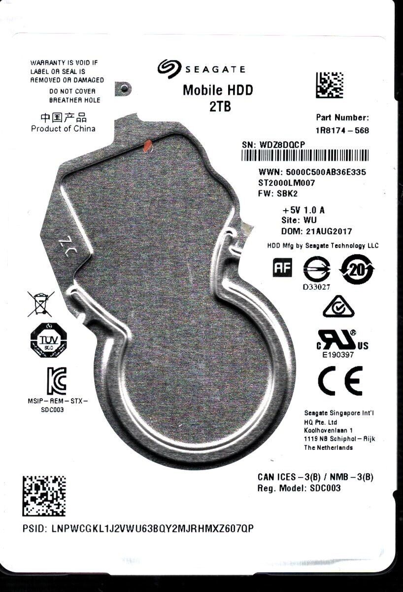 ST2000LM007 P/N: 1R8174-568 F/W: SBK2 S/N: WDZ8 WU 2TB AUG 2017 CHINA SEAGATE