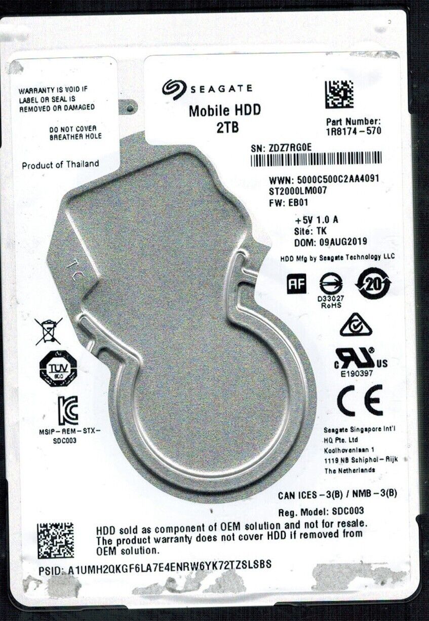 ST2000LM007 P/N: 1R8174-570 F/W: EB01 S/N: ZDZ7 TK 2TB AUG 2019 THAILAND SEAGATE