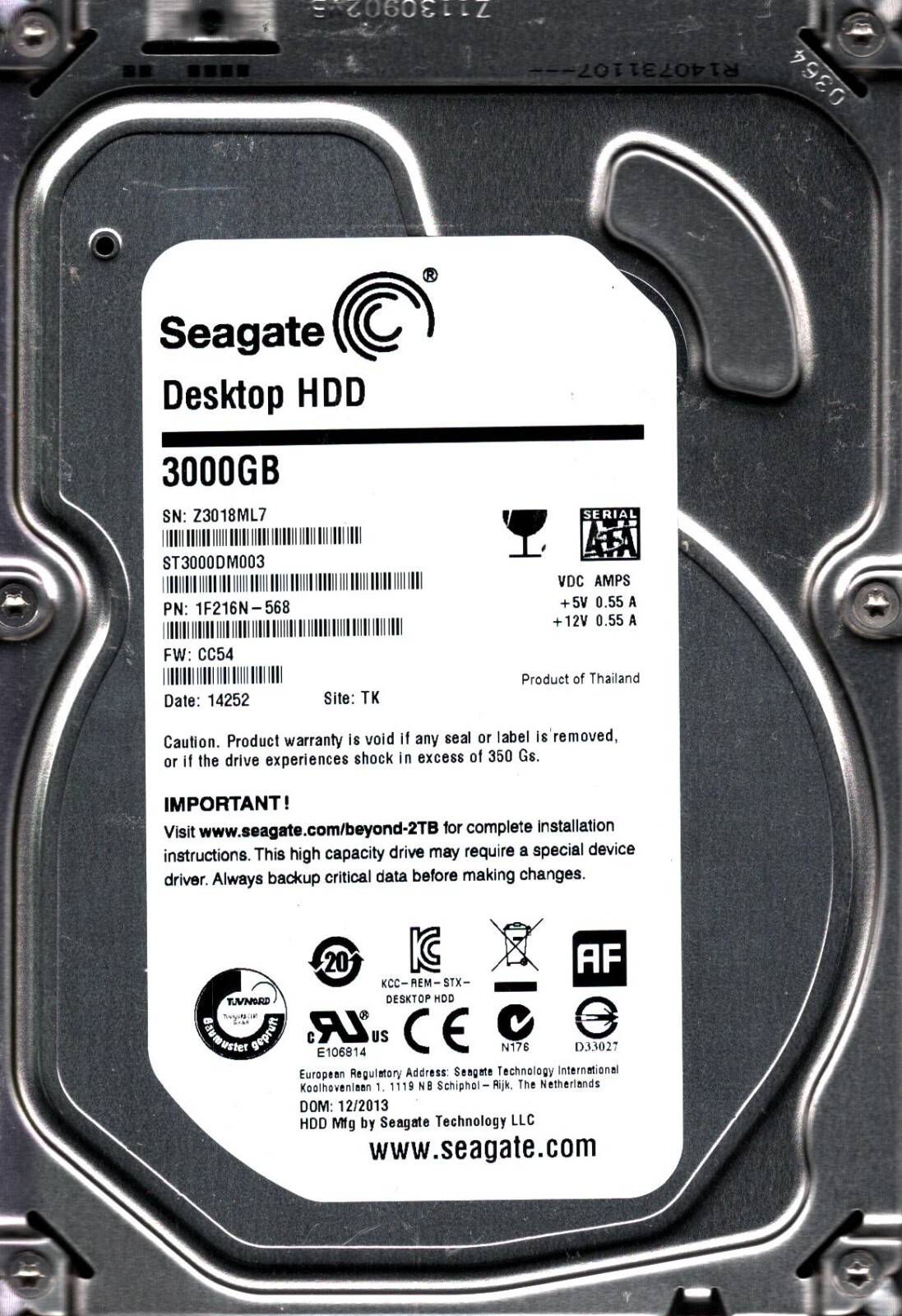 ST3000DM003 P/N: 1F216N-568 F/W: CC54 S/N: Z301 TK 3TB DEC 2013 THAILAND SEAGATE