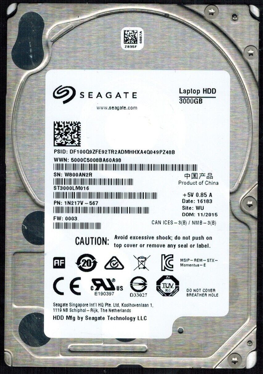 ST3000LM016 P/N: 1N217V-567 F/W: 0003 S/N: W800 WU 3TB NOV 2015 CHINA SEAGATE