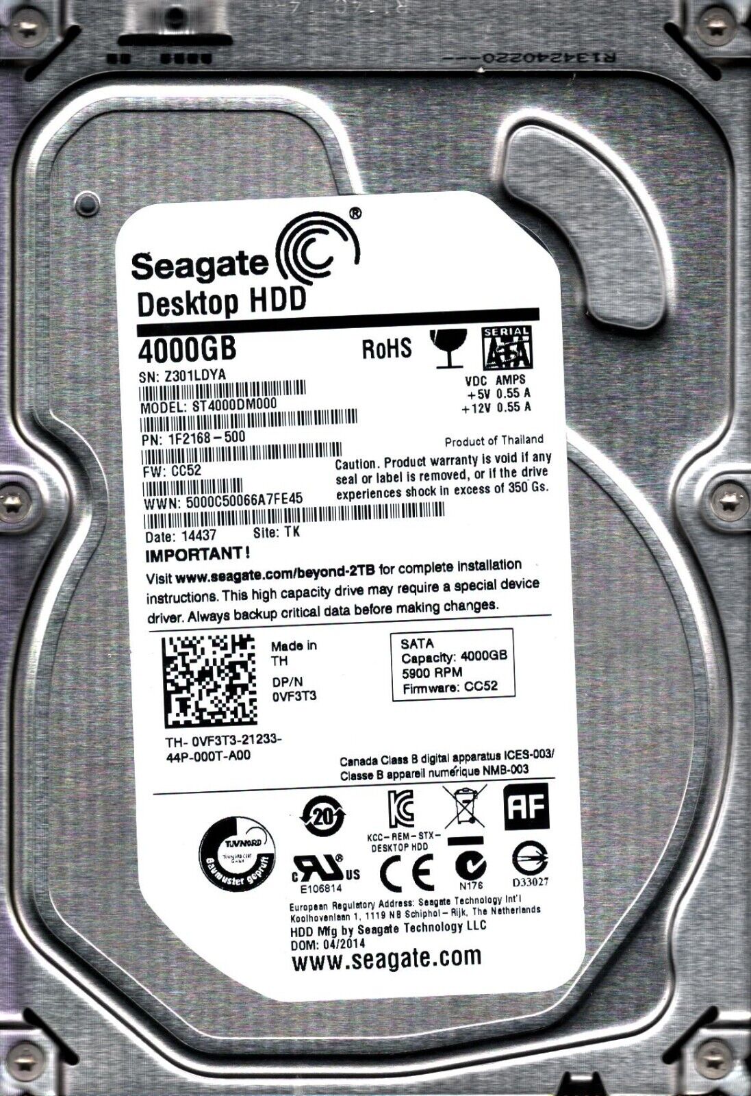 ST4000DM000 P/N: 1F2168-500 F/W: CC52 S/N: Z301 TK 4TB APR 2014 THAILAND SEAGATE