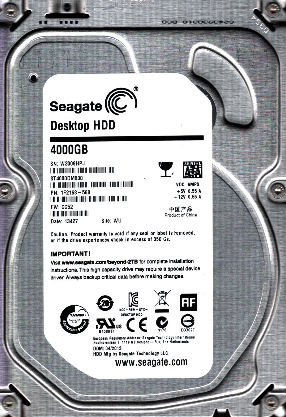 ST4000DM000 P/N: 1F2168-568 F/W: CC52 S/N: W300 WU 4TB APR 2013 CHINA SEAGATE