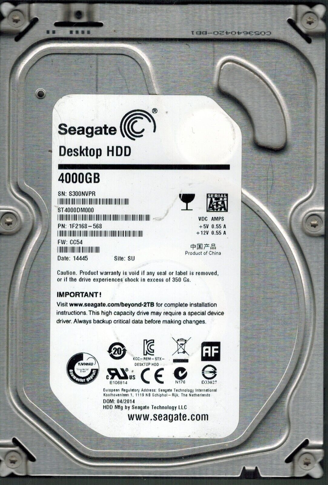 ST4000DM000 P/N: 1F2168-568 F/W: CC54 S/N: S300 SU 4TB 04/2014 SEAGATE