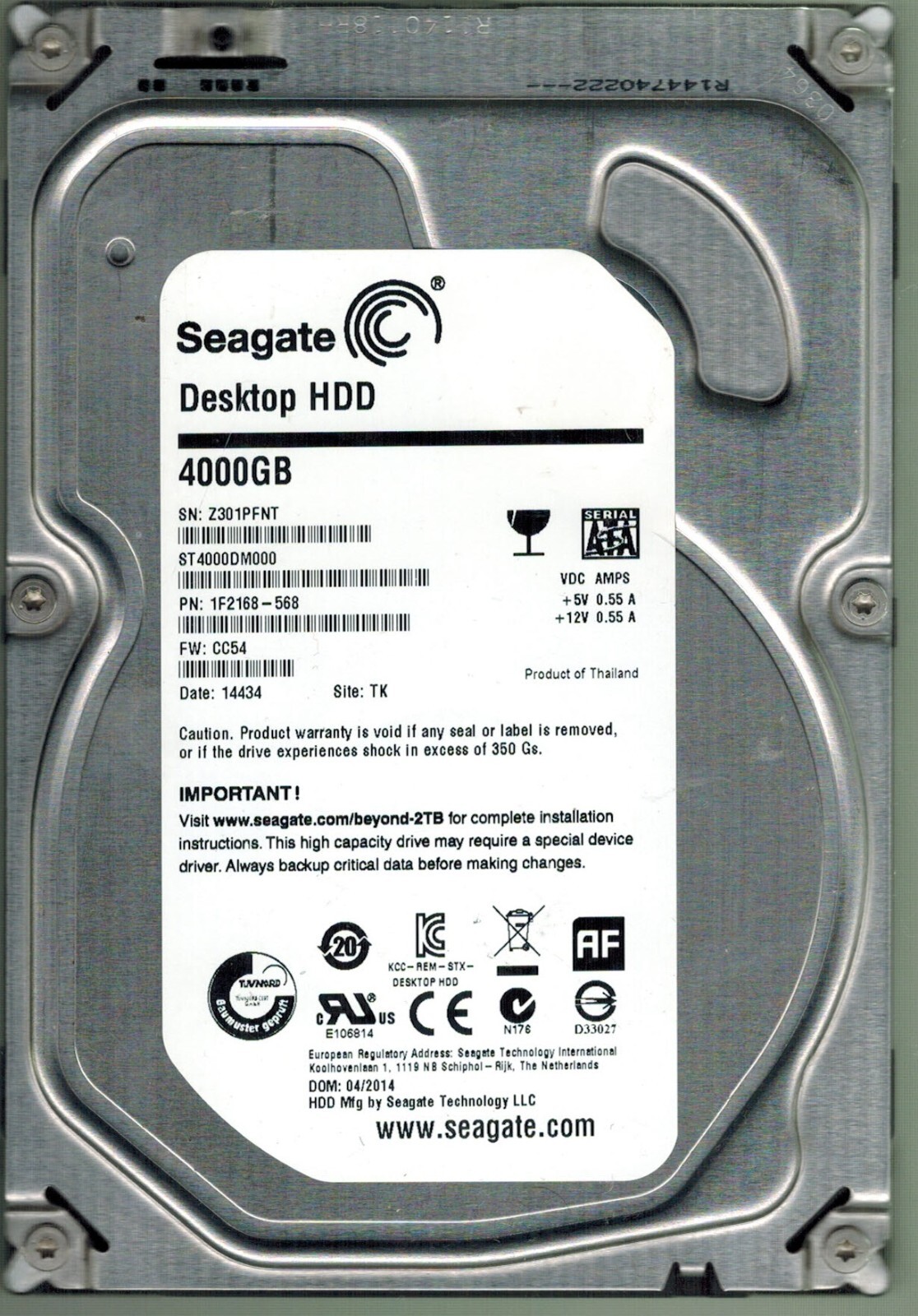 ST4000DM000 P/N: 1F2168-568 F/W: CC54 S/N: Z301 TK 4TB 04/2014 SEAGATE