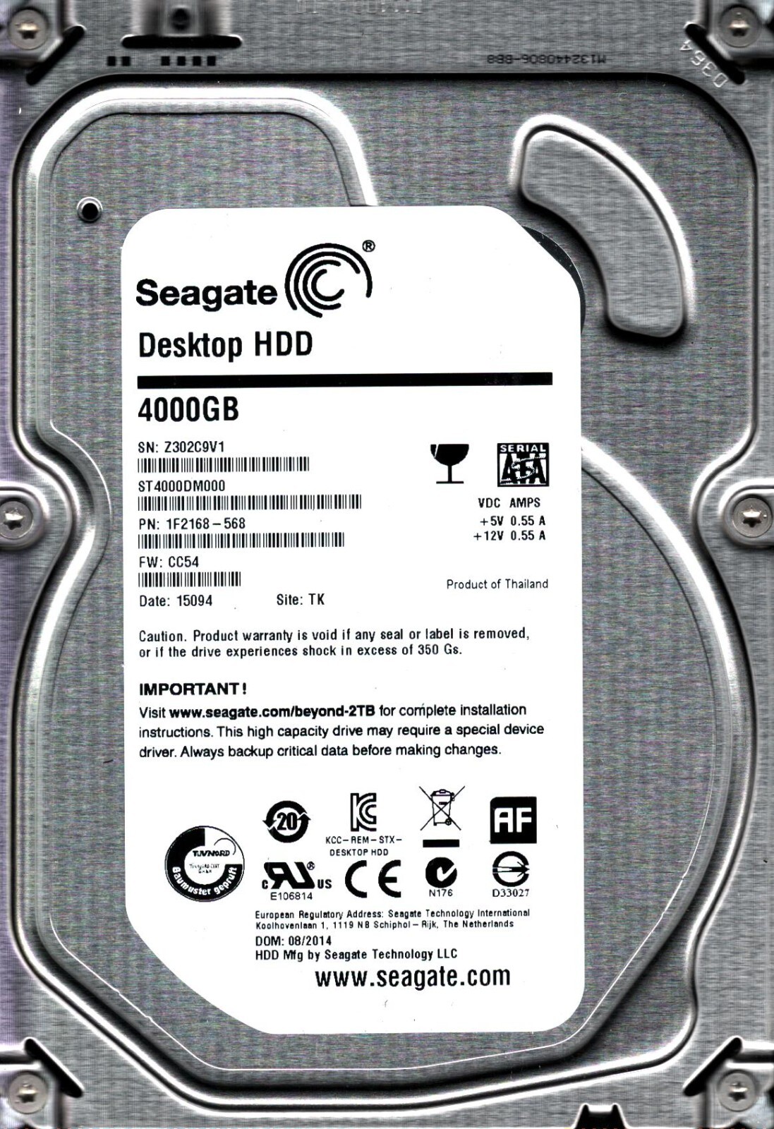 ST4000DM000 P/N: 1F2168-568 F/W: CC54 S/N: Z302 TK 4TB AUG 2014 THAILAND SEAGATE