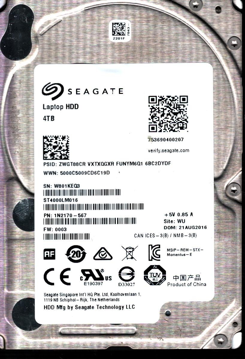 ST4000LM016 P/N: 1N2170-567 F/W: 0003 S/N: W801 WU 4TBAUG 2016 CHINA SEAGATE