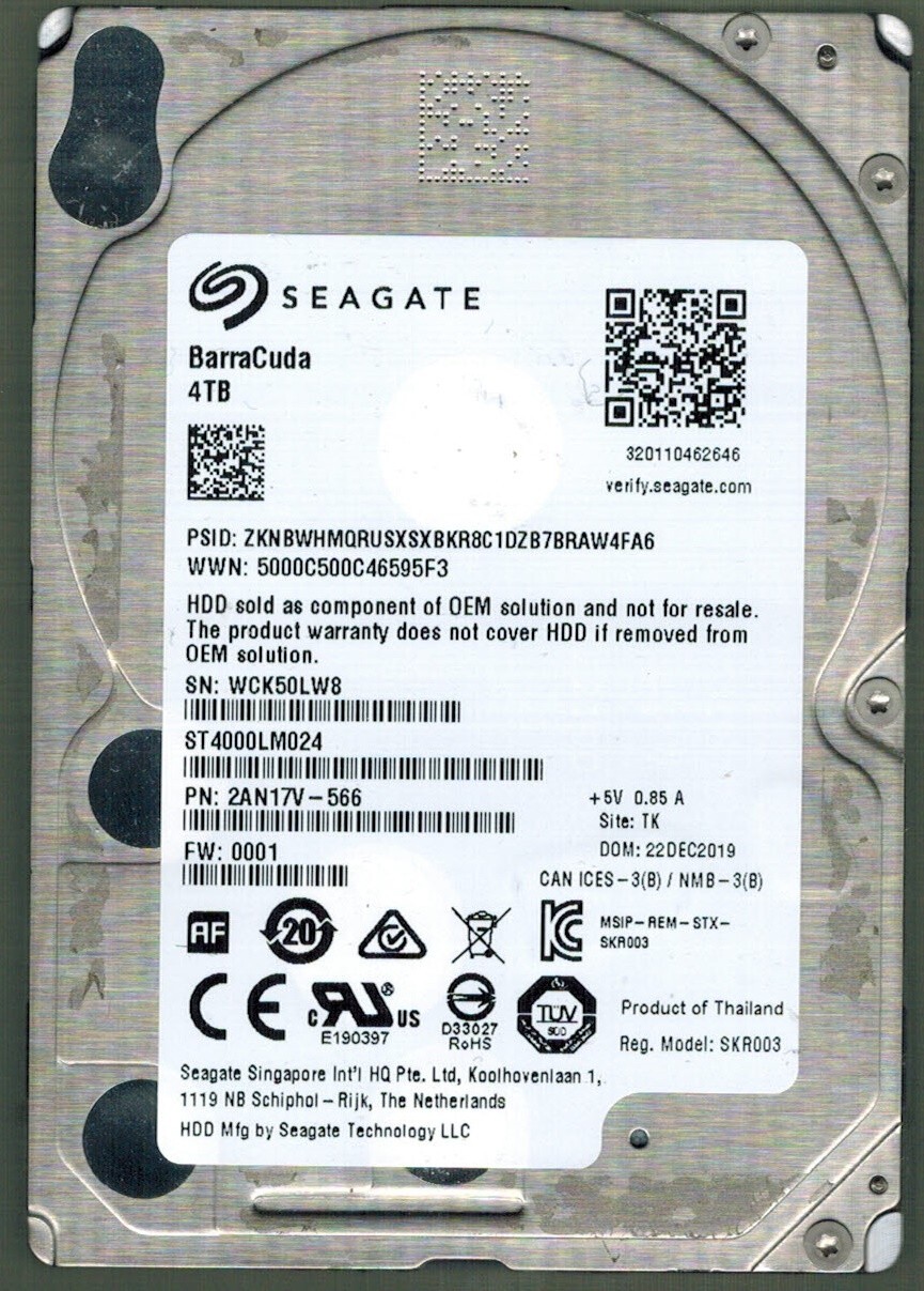 ST4000LM024 P/N: 2AN17V-566 F/W: 0001 S/N: WCK5 TK 4TB DEC 2019 THAILAND SEAGATE