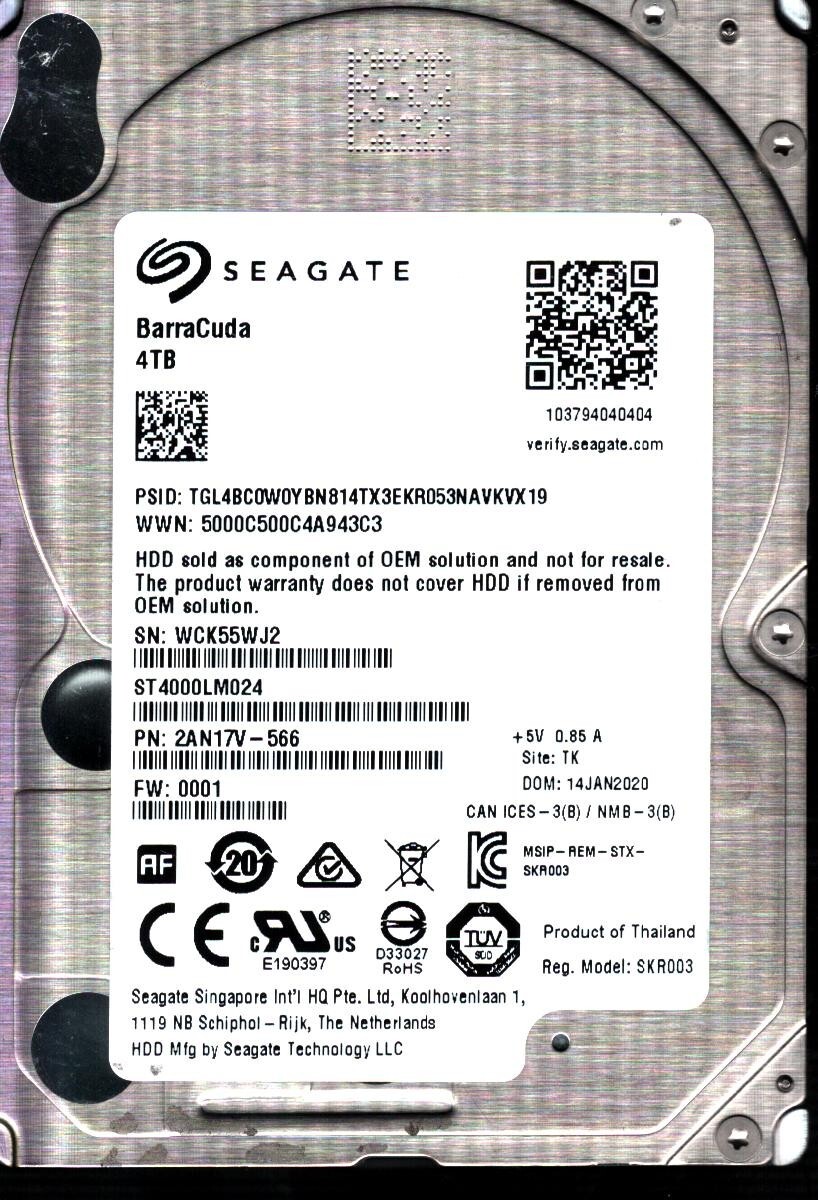 ST4000LM024 P/N: 2AN17V-566 F/W: 0001 S/N: WCK5 TK 4TB JAN 2020 THAILAND SEAGATE