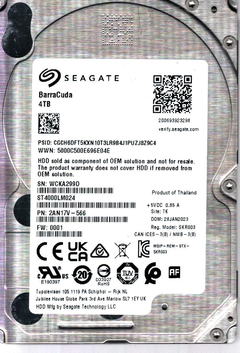 ST4000LM024 P/N: 2AN17V-566 F/W: 0001 S/N: WCKA TK 4TB JAN 2023 THAILAND SEAGATE