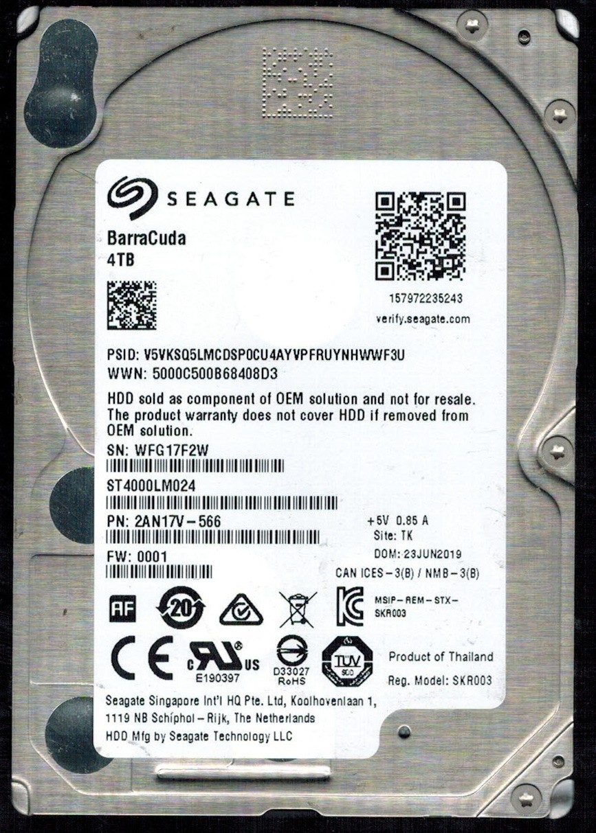 ST4000LM024 P/N: 2AN17V-566 F/W: 0001 S/N:WFG1 TK 4TB JUN 2019 THAILAND SEAGATE