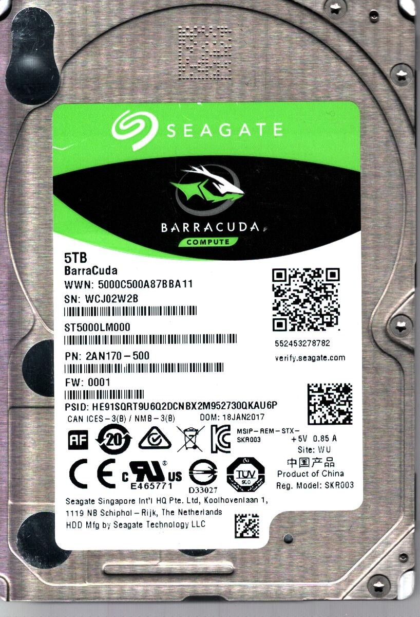 ST5000LM000 P/N: 2AN170-500 F/W: 0001 S/N: WCJ0 WU 5TB JAN 2017 CHINA SEAGATE
