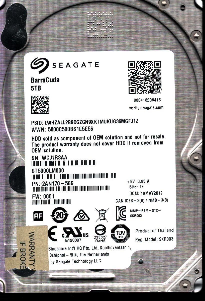 ST5000LM000 P/N: 2AN170-566 F/W: 0001 S/N: WCJ1 TK 5TB MAY 2019 THAILAND SEAGATE