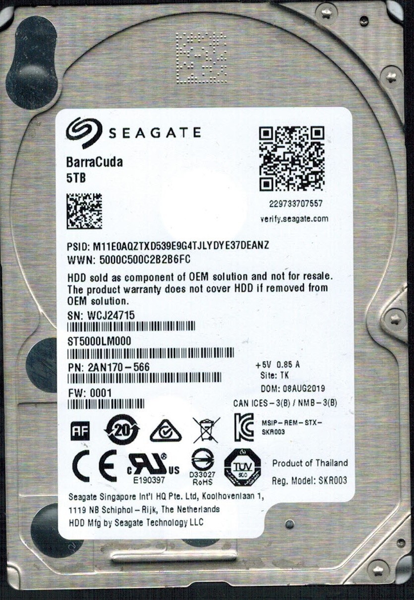 ST5000LM000 P/N: 2AN170-566 F/W: 0001 S/N: WCJ2 TK 5TB AUG 2019 THAILAND SEAGATE