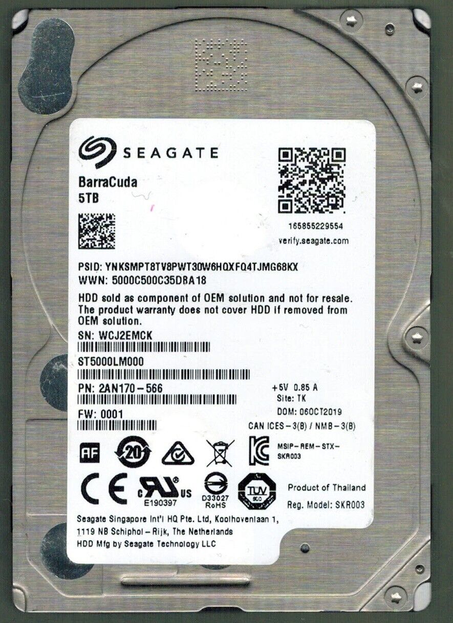 ST5000LM000 P/N: 2AN170-566 F/W: 0001 S/N: WCJ2 TK 5TB OCT 2019 THAILAND SEAGATE