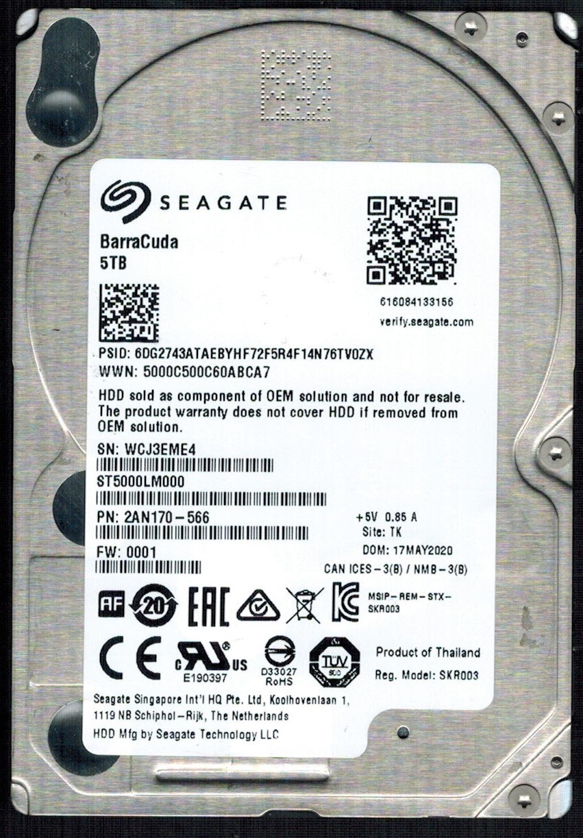 ST5000LM000 P/N: 2AN170-566 F/W: 0001 S/N: WCJ3 TK 5TB MAY 2020 THAILAND SEAGATE