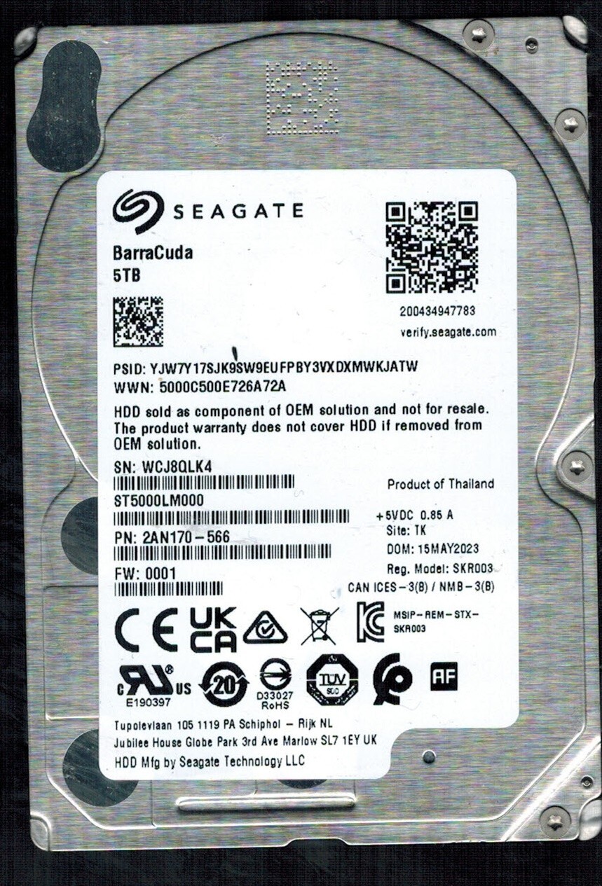 ST5000LM000 P/N: 2AN170-566 F/W: 0001 S/N: WCJ8 TK 5TB MAY 2023 THAILAND SEAGATE