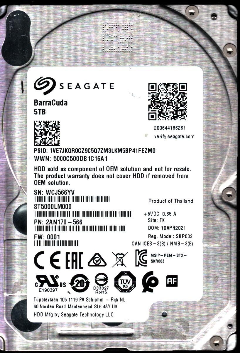 ST5000LM000 P/N: 2AN170-566 F/W: 0001 S/N:WCJ5 TK 5TB APR 2021 THAILAND SEAGATE
