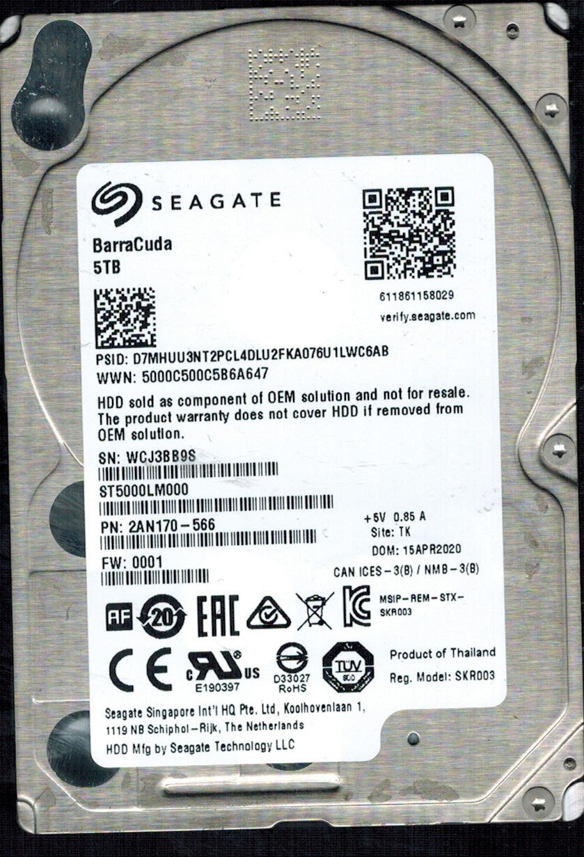 ST5000LM000 P/N: 2AN170-566 F/W:0001 S/N: WCJ3 TK 5TB APR 2020 THAILAND SEAGATE