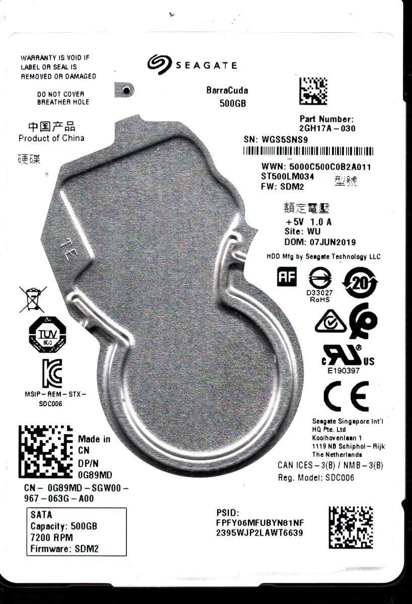 ST500LM034 P/N: 2GH17A-030 F/W: SDM2 S/N: WGS5 WU 500GB JUN 2019 CHINA SEAGATE
