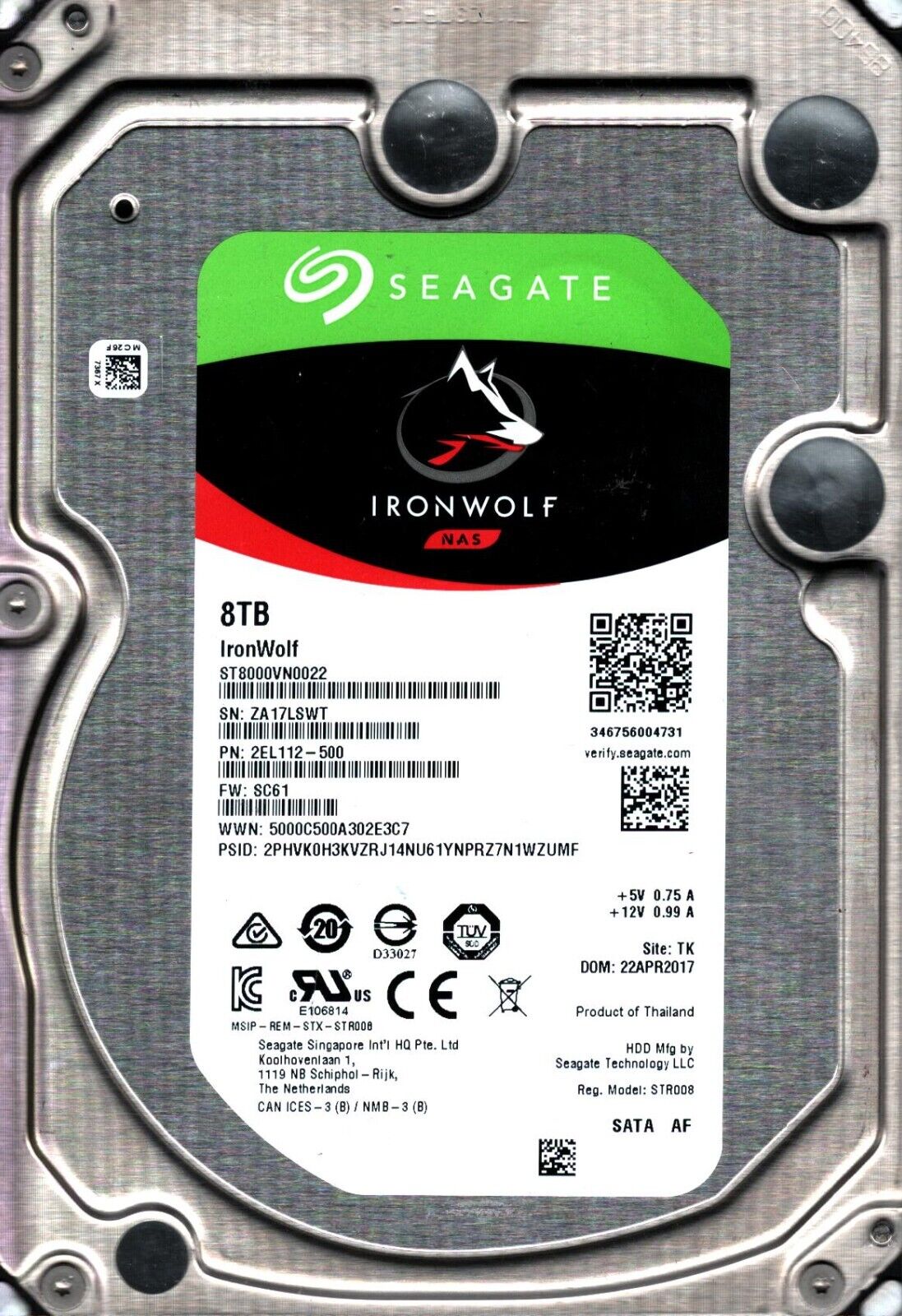 ST8000VN0022 P/N: 2EL112-500 F/W: SC61 S/N:ZA17 TK 8TB APR 2017 THAILAND SEAGATE