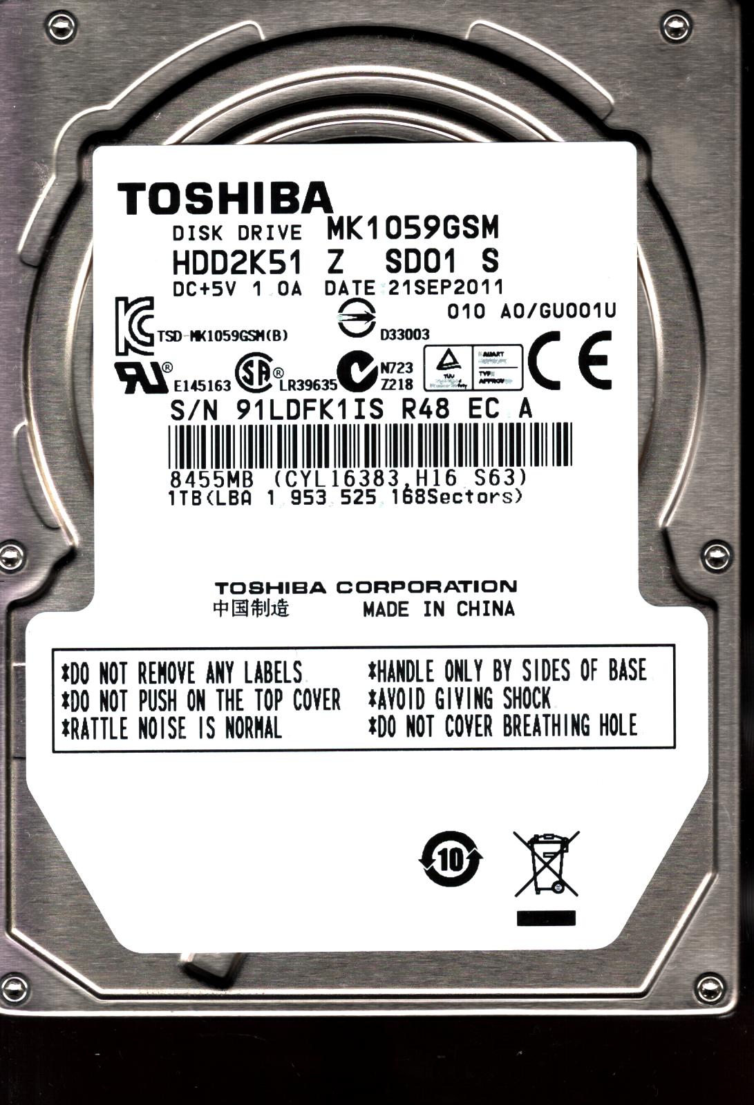 MK1059GSM P/N: HDD2K51 Z SL01 S 010 A0/GU001U 1TB SEP 2011 CHINA TOSHIBA