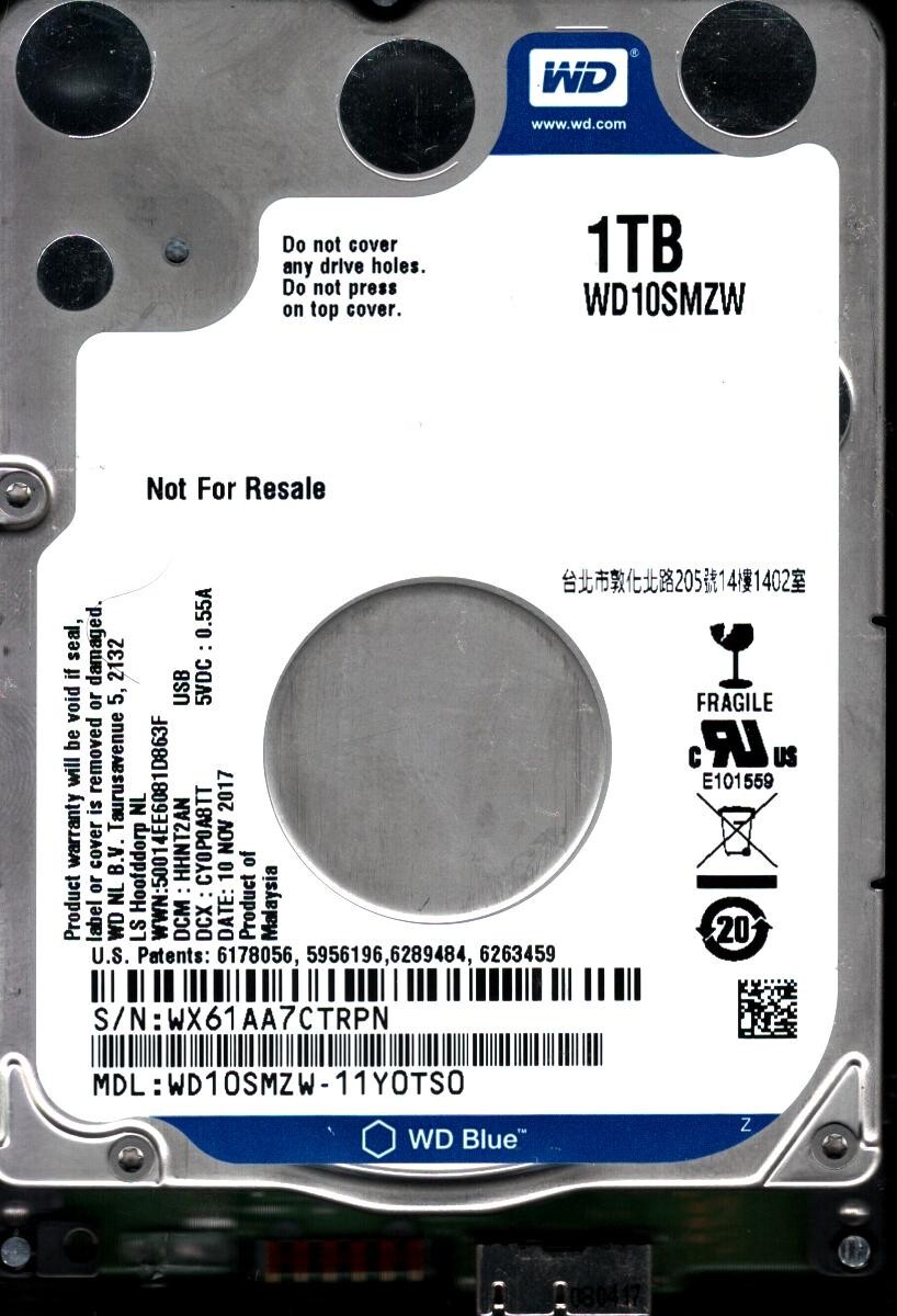 WD10SMZW-11Y0TS0 S/N: WX61A DCM: HHNT2AN WESTERN DIGITAL 1TB MALAYSIA NOV 2017
