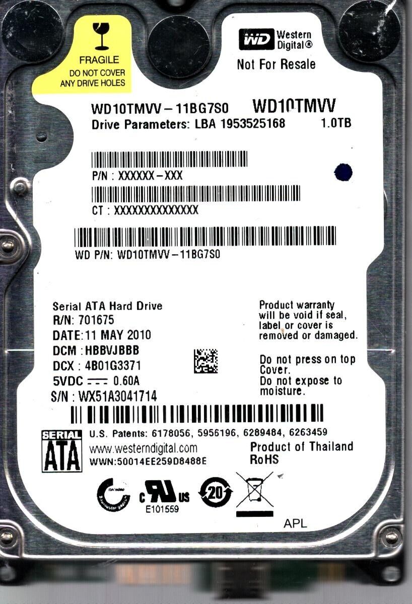 WD10TMVV-11BG7S0 S/N: WX51A DCM: HBBVJBBB WESTERN DIGITAL 1TB THAILAND MAY 2010