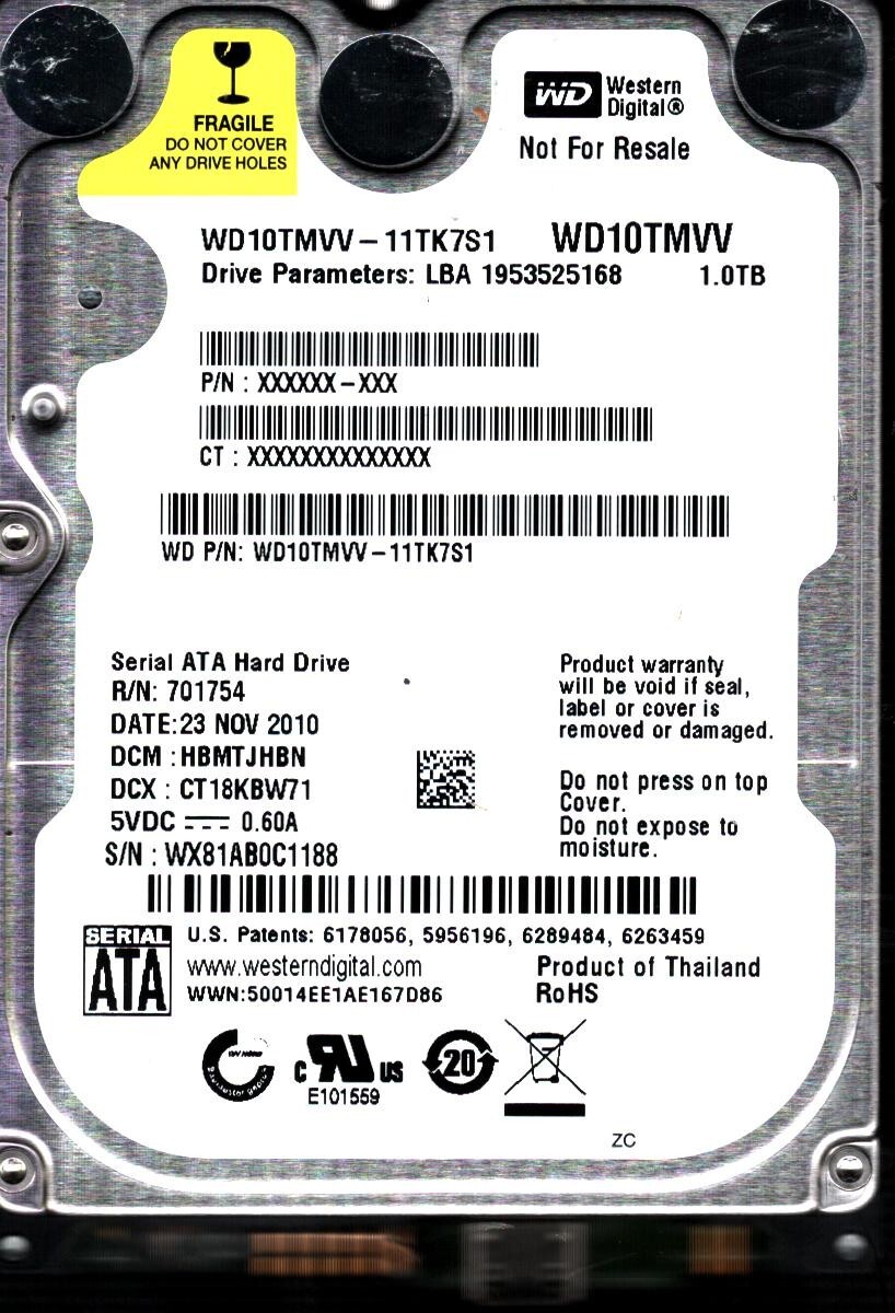 WD10TMVV-11TK7S1 S/N: WX81A DCM: HBMTJHBN WESTERN DIGITAL 1TB THAILAND NOV 2010