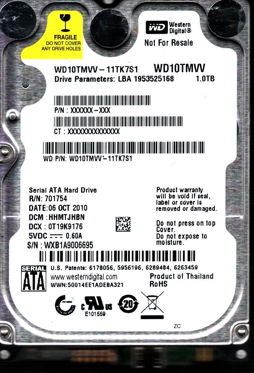 WD10TMVV-11TK7S1 S/N: WXB1A DCM: HHMTJHBN WESTERN DIGITAL 1TB THAILAND OCT 2010