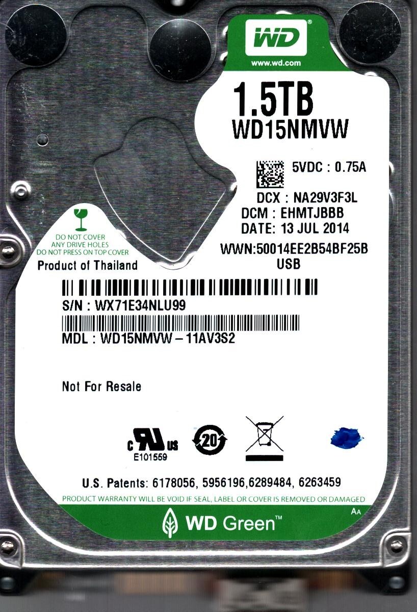 WD15NMVW-11AV3S2 S/N: WX71E DCM:EHMTJBBB WESTERN DIGITAL 1.5TB THAILAND JUL 2014