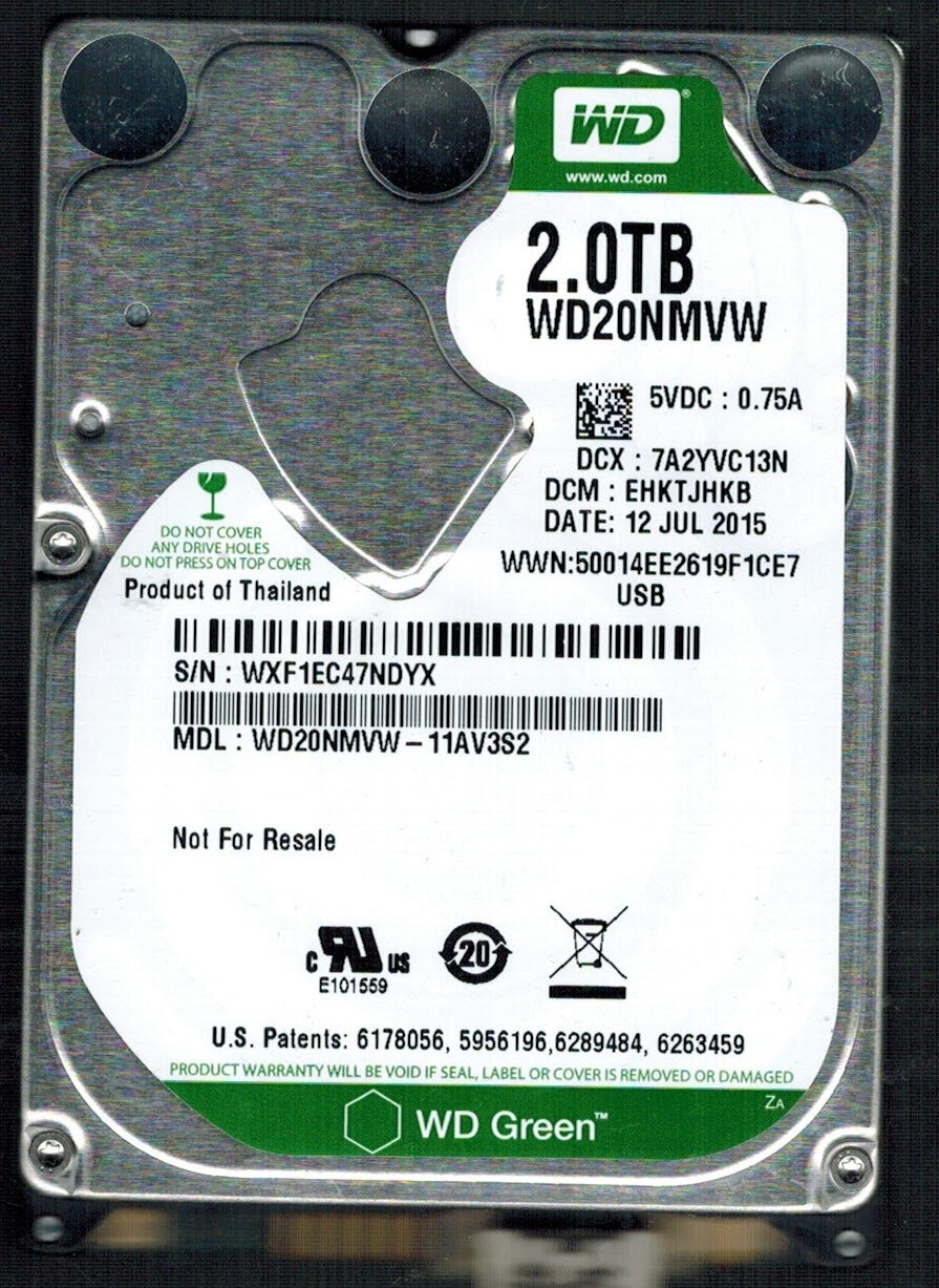 WD20NMVW-11AV3S2 S/N: WXF1E DCM: EHKTJHKB WESTERN DIGITAL 2TB THAILAND JUL 2015