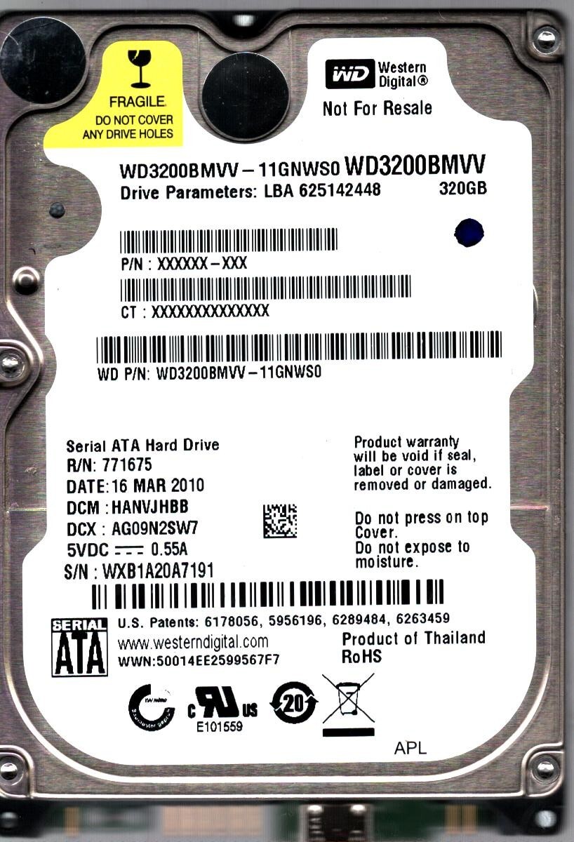 WD3200BMVV-11GNWS0 S/N:WXB1 DCM:HANVJHBB WESTERN DIGITAL 320GB THAILAND MAR 2010