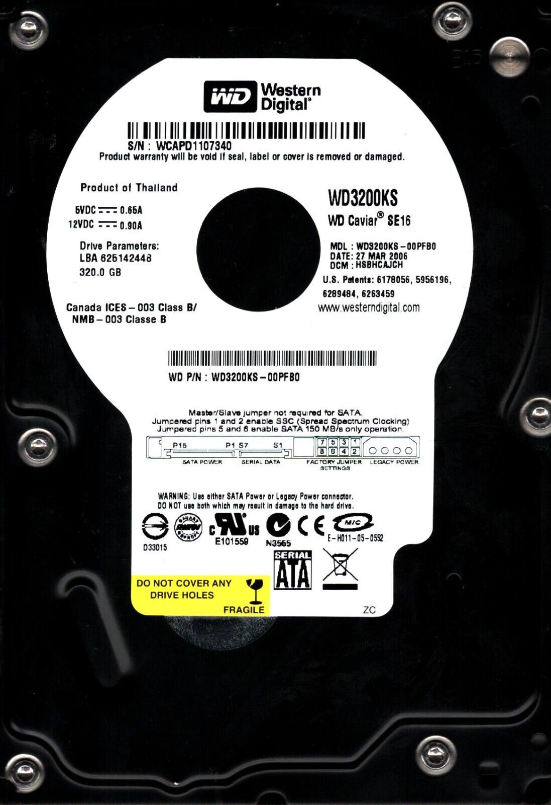 WD3200KS-00PFB0 S/N: WCAPD DCM: HSBHCAJCH WESTERN DIGITAL 320GB THAILAND MAR 200