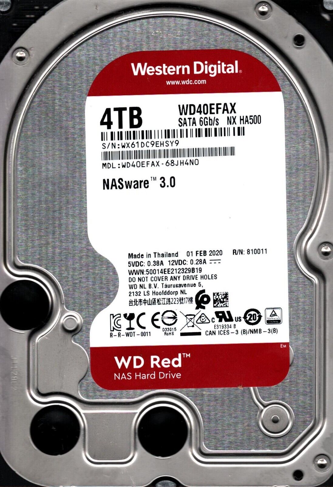 WD40EFAX-68JH4N0 S/N: WX61D WESTERN DIGITAL 4TB THAILAND FEB 2020