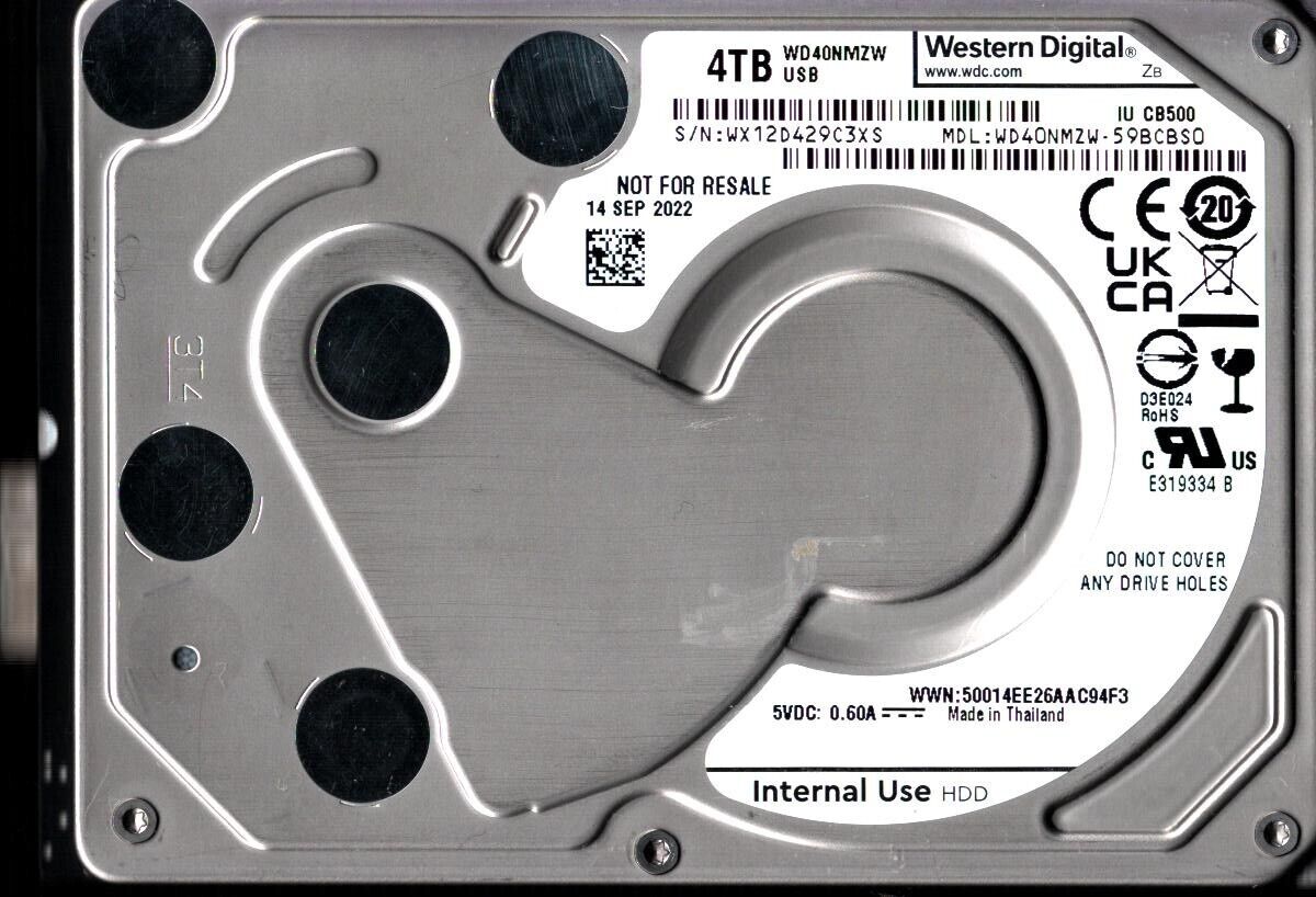 WD40NMZW-59BCBS0 S/N: WX12D WESTERN DIGITAL 4TB THAILAND SEP 2022