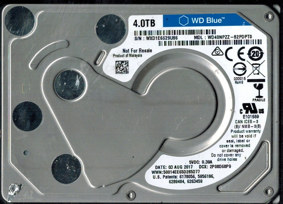 WD40NPZZ-82PDPT0 S/N: WXD1E WESTERN DIGITAL 4TB MALAYSIA AUG 2017 DCX: 2P08D68P9