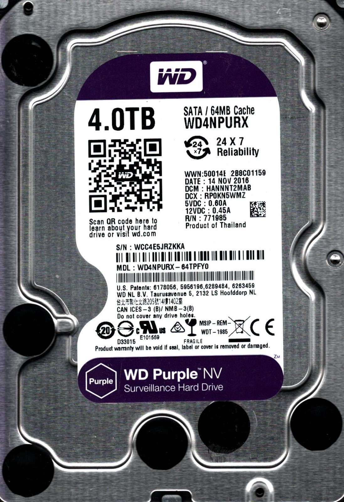 WD4NPURX-64TPFY0 S/N: WCC4 DCM: HANNNT2MAB WESTERN DIGITAL 4TB THAILAND NOV 2016