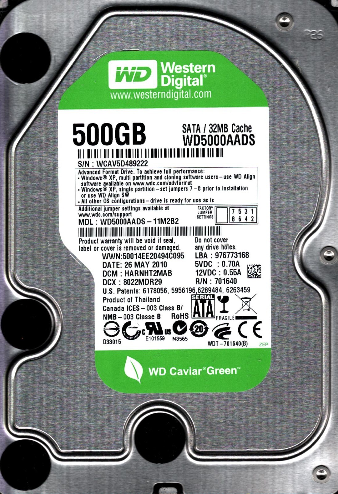 WD5000AADS-11M2B2 DCM: HARNHT2MAB WESTERN DIGITAL 500GB THAILAND MAY 2010