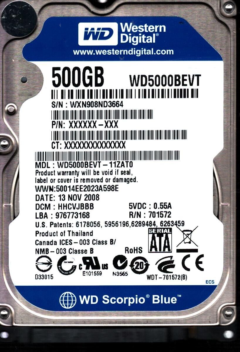 WD5000BEVT-11ZAT0 S/N:WXN90 DCM:HHCVJBBB WESTERN DIGITAL 500GB THAILAND NOV 2008