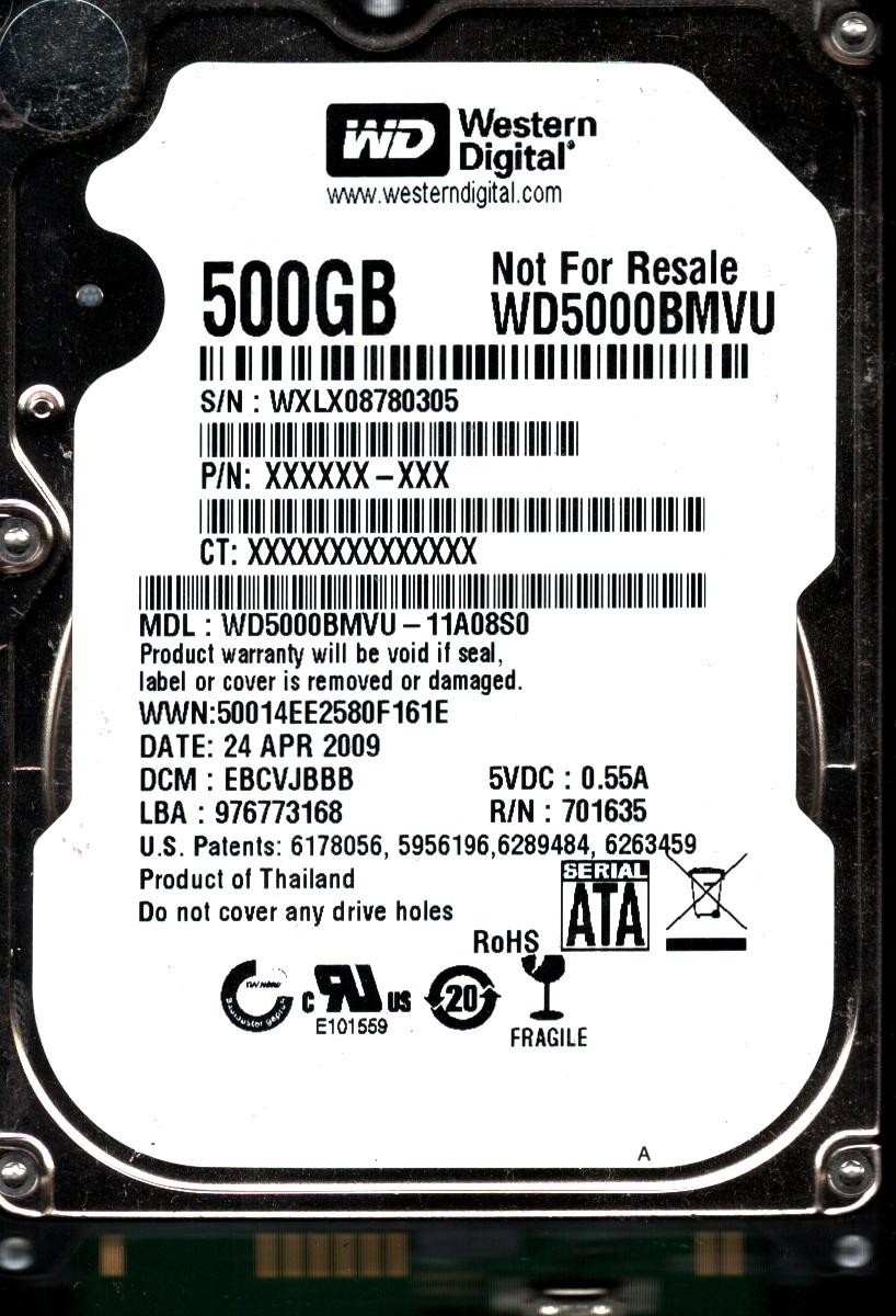 WD5000BMVU-11A08S0 S/N: WXLX0 DCM: EBCVJBBB WD 500GB THAILAND APR 2009