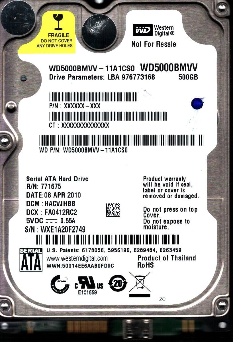 WD5000BMVV-11A1CS0 S/N:WXE DCM: HACVJHBB WESTERN DIGITAL 500GB THAILAND APR 2010