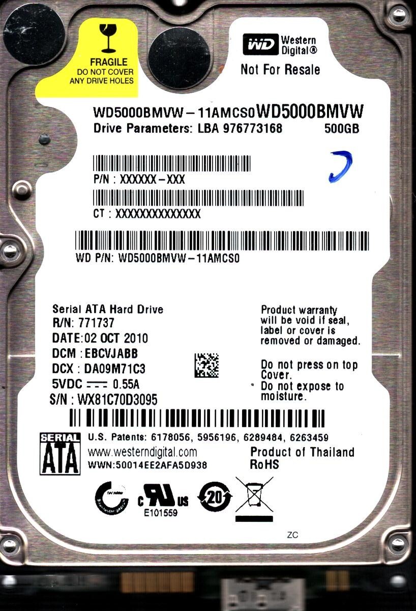 WD5000BMVW-11AMCS0 S/N:WX81C DCM:EBCVJABB WESTERN DIGITAL 500GB THAILAND OCT2010