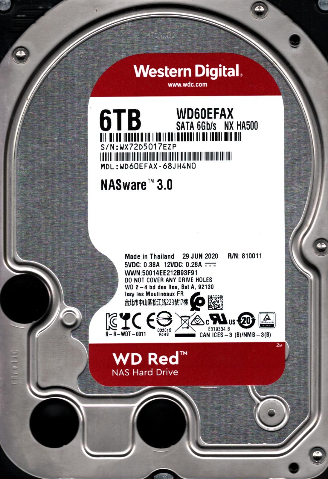 WD60EFAX-68JH4N0 S/N: WX72D WESTERN DIGITAL 6TB THAILAND JUN 2020