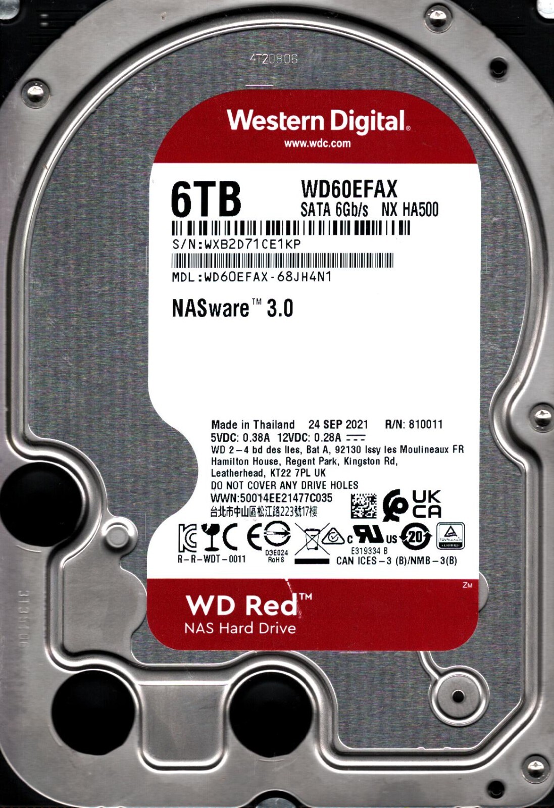 WD60EFAX-68JH4N1 S/N: WXB2D WESTERN DIGITAL 6TB THAILAND SEP 2021