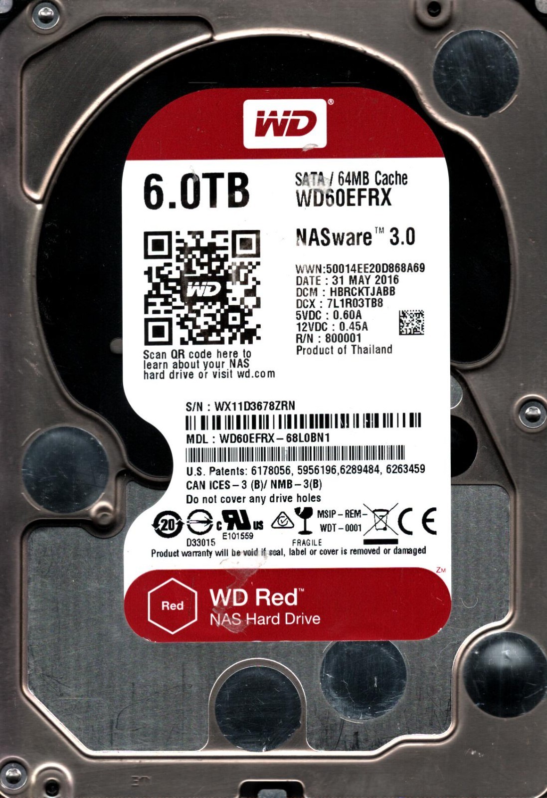 WD60EFRX-68L0BN1 S/N: WX11D DCM: HBRCKTJABB WD 6TB THAILAND MAY 2016