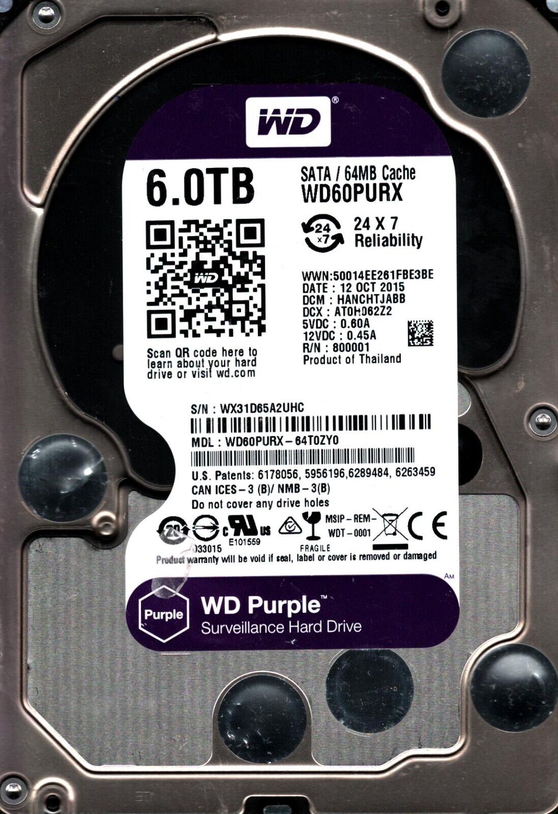 WD60PURX-64T0ZY0 S/N:WX31D DCM: HANCHTJABB WESTERN DIGITAL 6TB THAILAND OCT 2015
