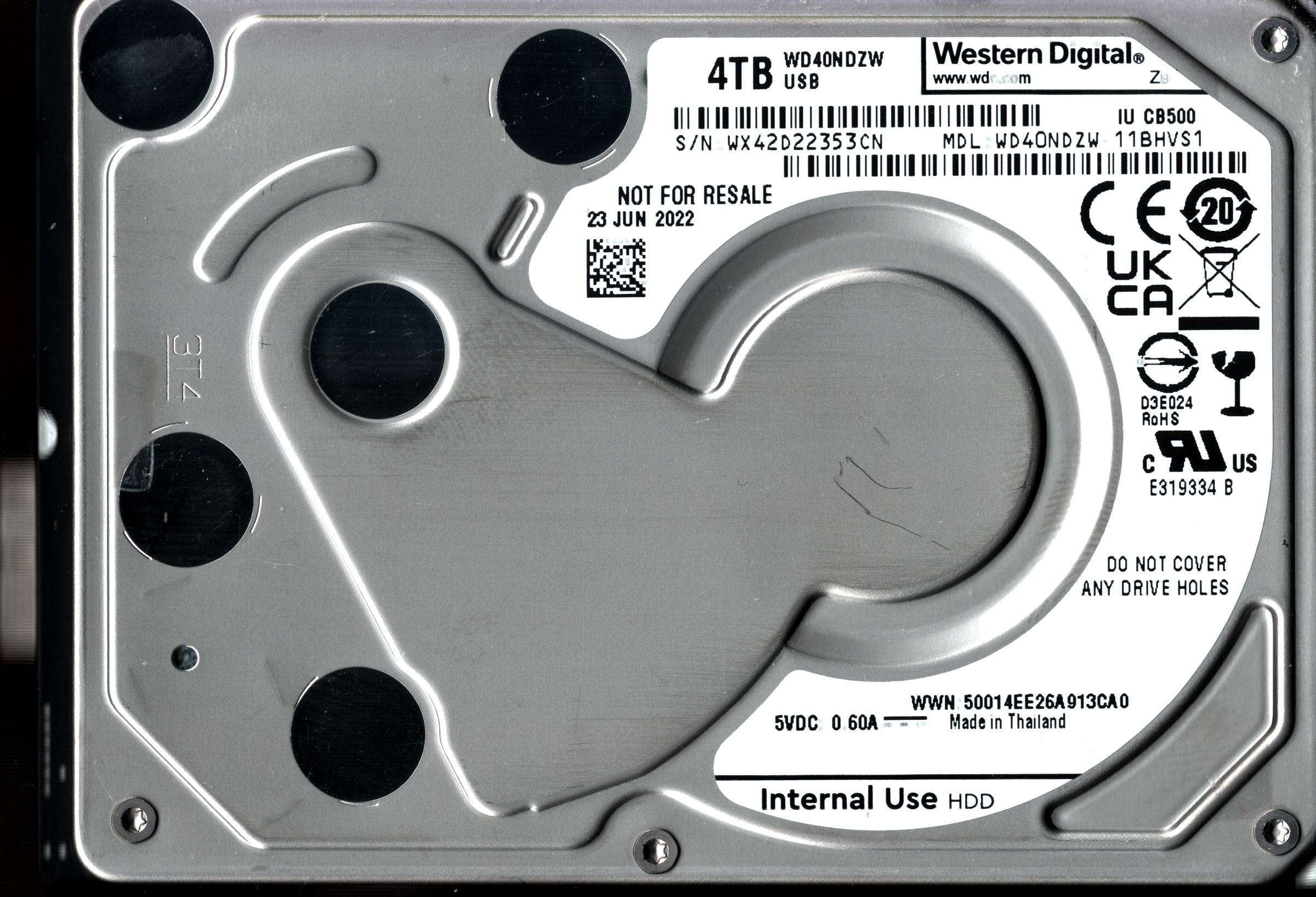 WD40NDZW-11BHVS1 S/N: WX42D WESTERN DIGITAL 4TB THAILAND JUN 2022