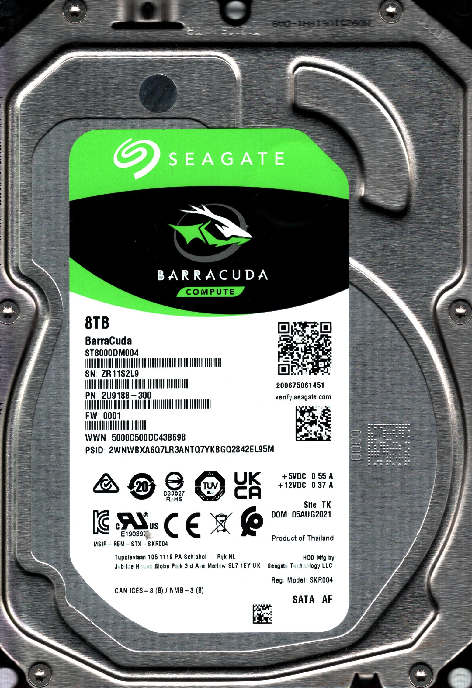 ST8000DM004 P/N: 2U9188-300 F/W: 0001 S/N: ZR11S 8TB AUG 2021 THAILAND SEAGATE