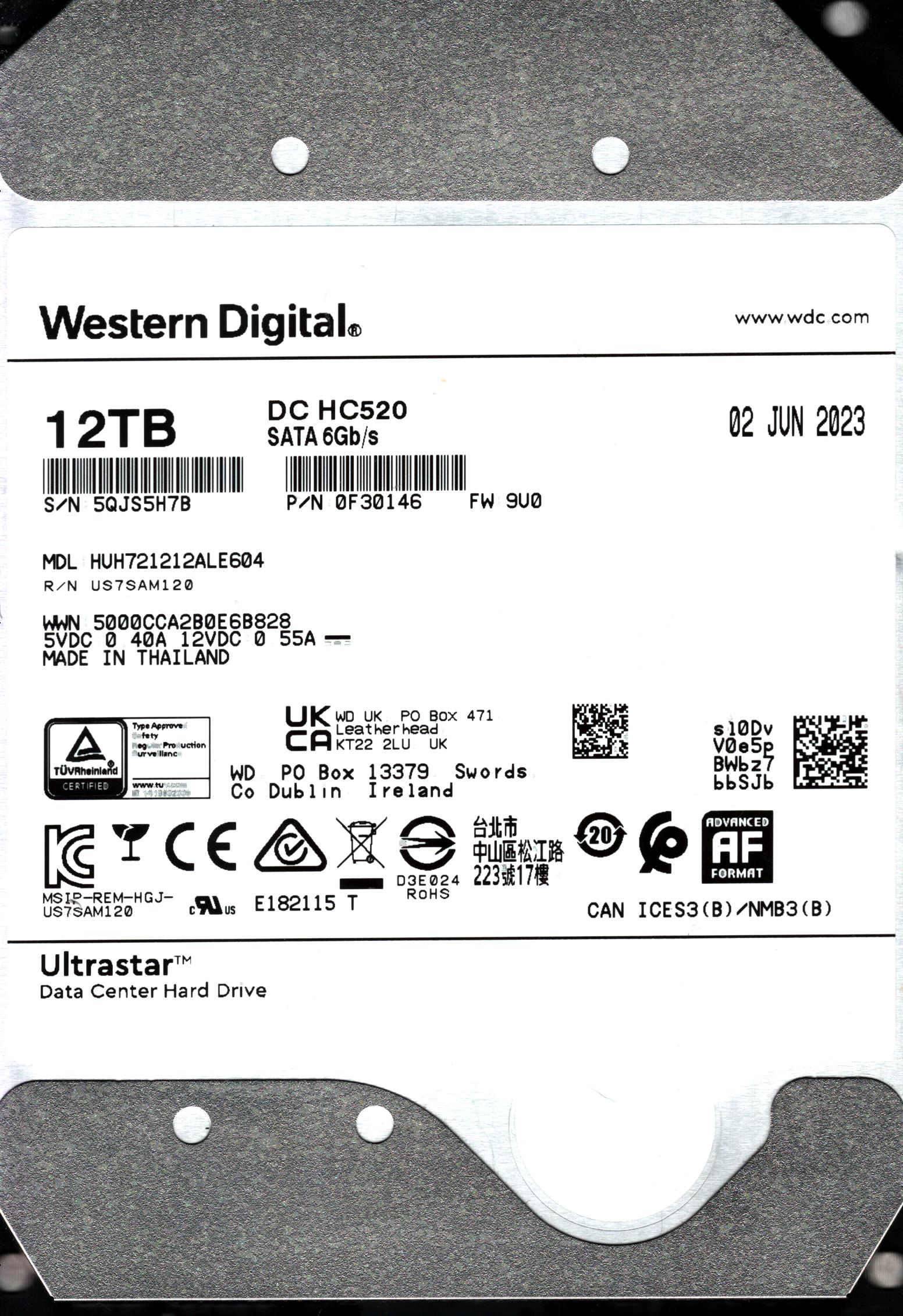 HUH721212ALE604 S/N: 5QJS5 WESTERN DIGITAL 12TB THAILAND JUN 2023