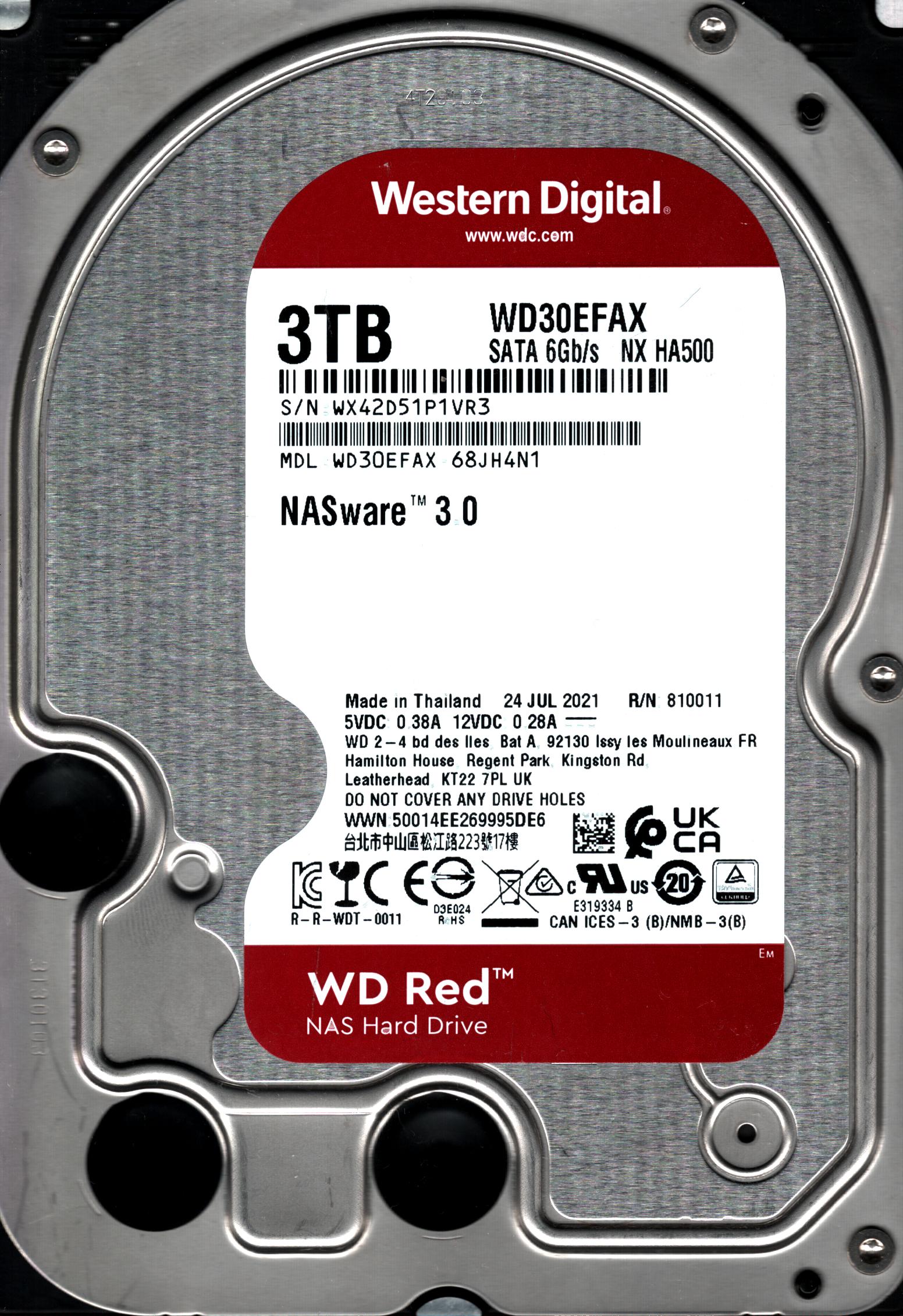 WD30EFAX-68JH4N1 S/N: WX42D WESTERN DIGITAL 3TB THAILAND JUL 2021